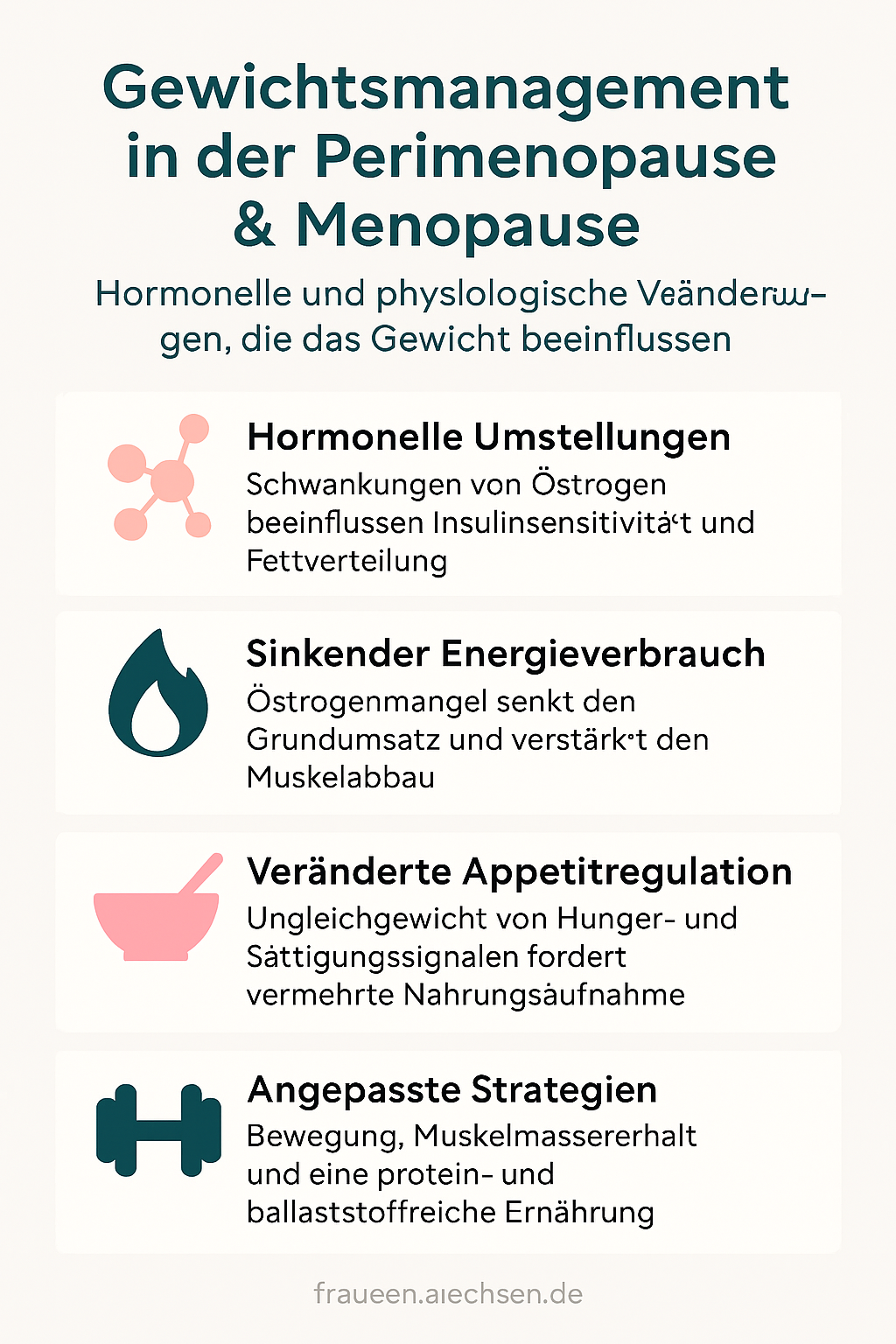 Viele Frauen bemerken bereits in der Übergangsphase zur Menopause, dass das Gewicht leichter steigt und sich hartnäckiger hält. Diese Veränderungen sind nicht zufällig: Sie beruhen auf klar nachvollziehbaren hormonellen und metabolischen Prozessen, die sich in dieser Lebensphase grundlegend verändern. Eine erfolgreiche Gewichtsregulation erfordert daher ein Verständnis der physiologischen Hintergründe – und eine entsprechend angepasste Strategie.